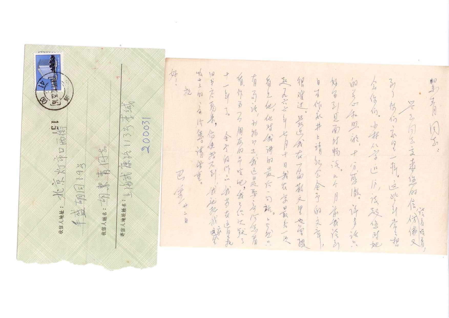 1977年12月22日巴金先生写给老舍夫人胡絜青的信件