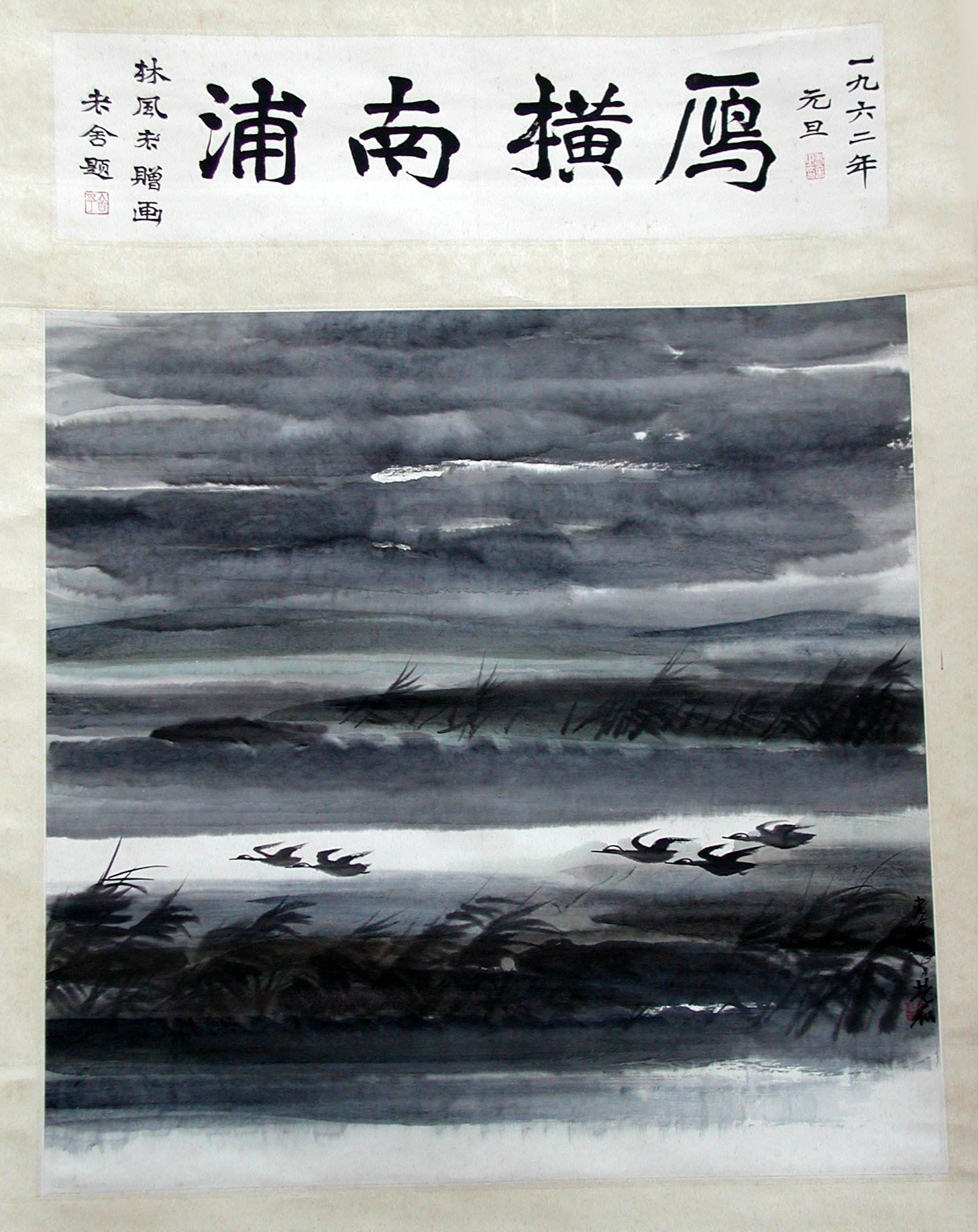 老舍先生家收藏的一九六二年林风眠赠画,后老舍为此画题字。此作品为水墨大写意风景画。自上而下描绘了密布的阴云,疾风中的浅滩芦苇,水塘,和几只水鸟逆风急速地在低空掠过。画面充满了紧迫的节奏感和流畅的动感,充分体现了画家综合中西方绘画技法的独创风格。