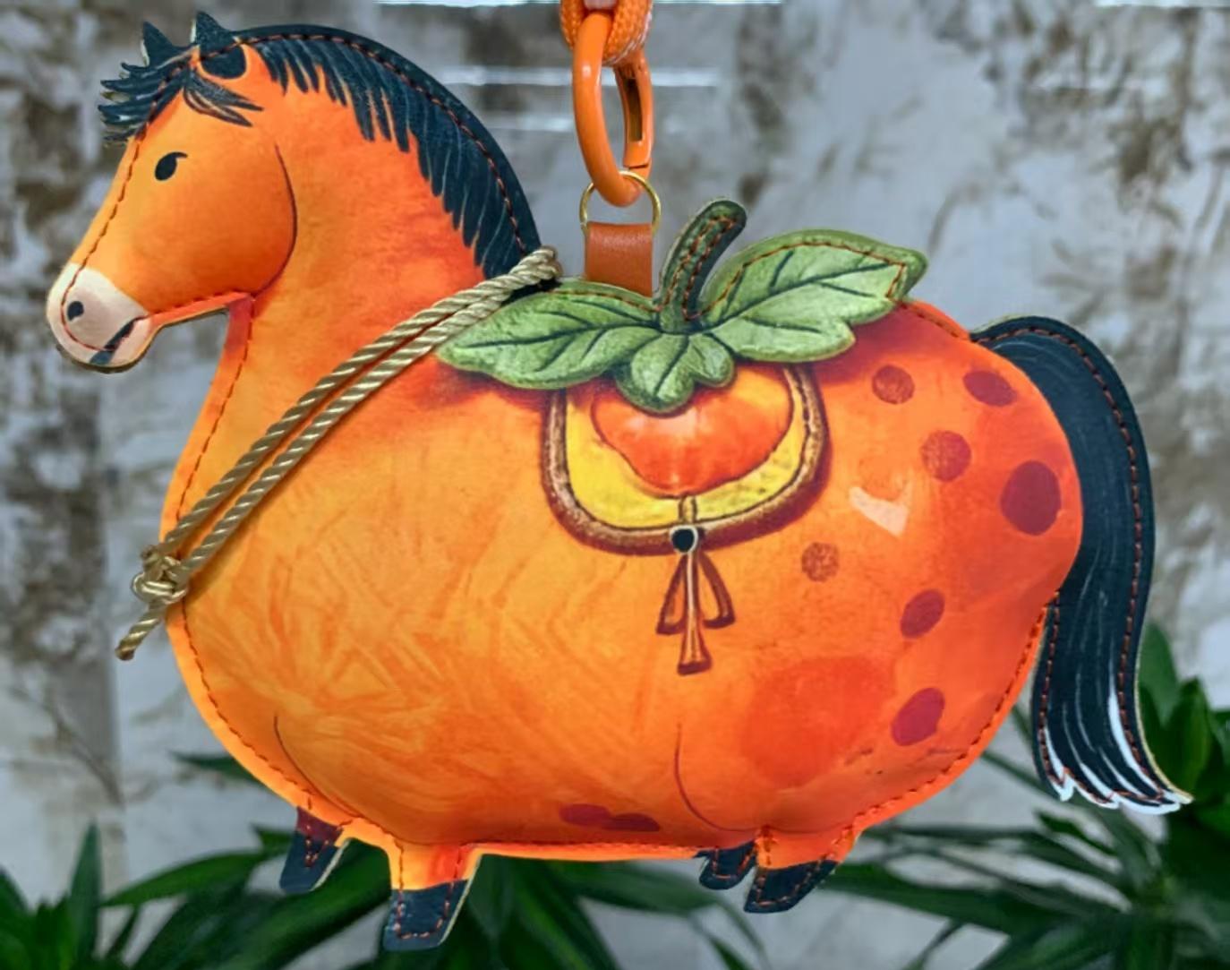 金线勾勒马形轮廓,暖橙丝线织就柿果马鞍,缀以树脂柿子吊坠,把丹柿小院的祝福织进日常穿搭。