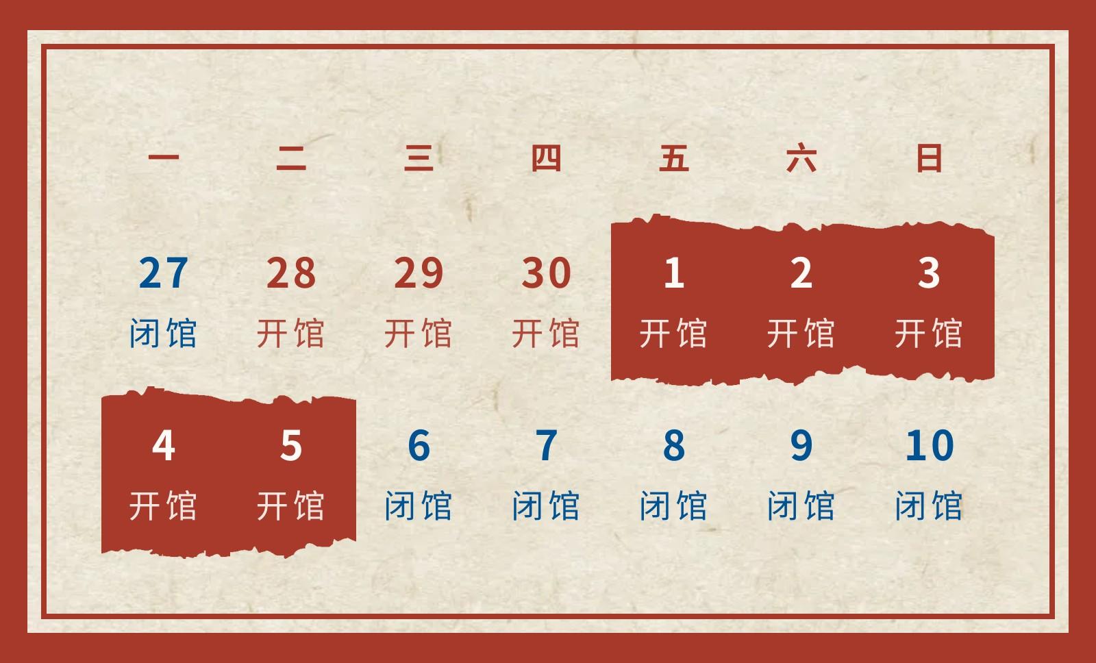 2026年5月1日(周五)至5月5日(周二)正常开放(9:00-17:00,16:30停止入馆)。